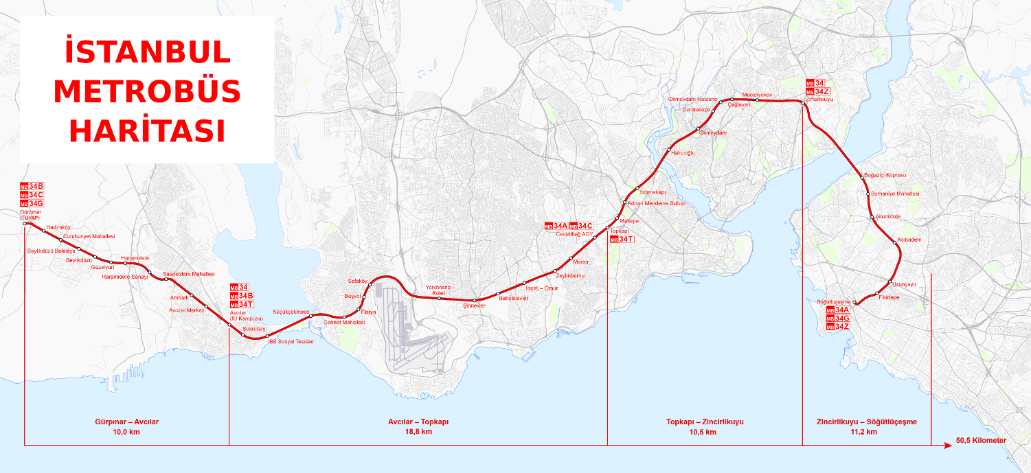 İstanbul metrobüs hattı toplam kaç kilometre sorusuna şu an için 50.5 kilometre olarak yanıt verilebilir.